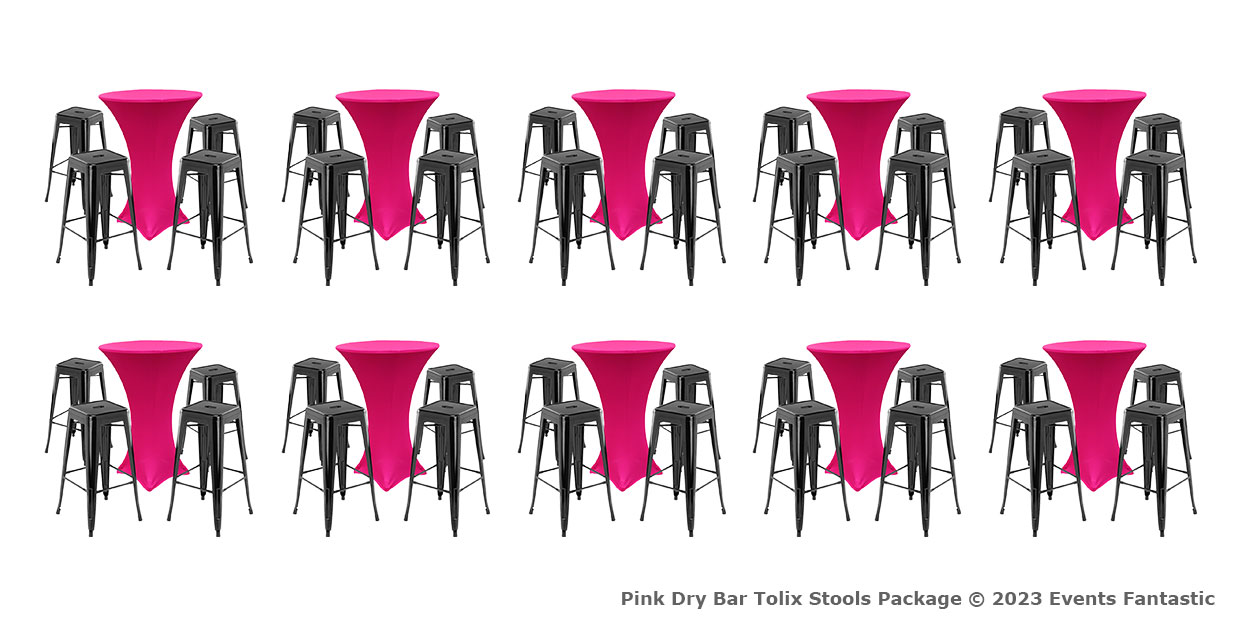 Corporate parties, cocktail receptions, and social mixers are best suited for the 10 Pink Dry Bars with 40 Black Tolix Stools Package.