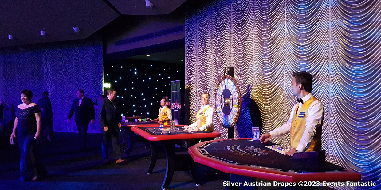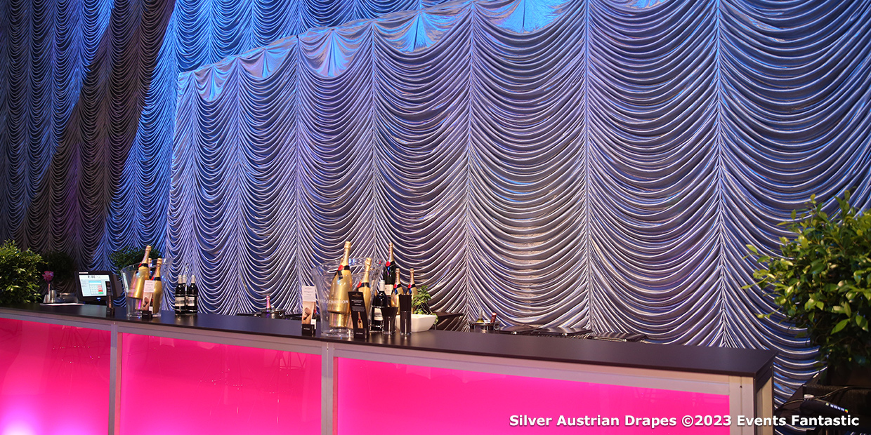 When paired with LED strip lights, the Austrian Drape Silver transforms into a dynamic backdrop. The soft, reflective fabric absorbs and reflects lighting, enabling a myriad of colour combinations. This transformative effect adds a magical touch to any event, be it a corporate awards night or a romantic wedding backdrop.Product Features