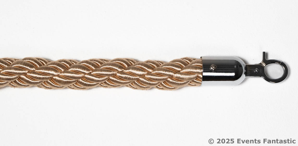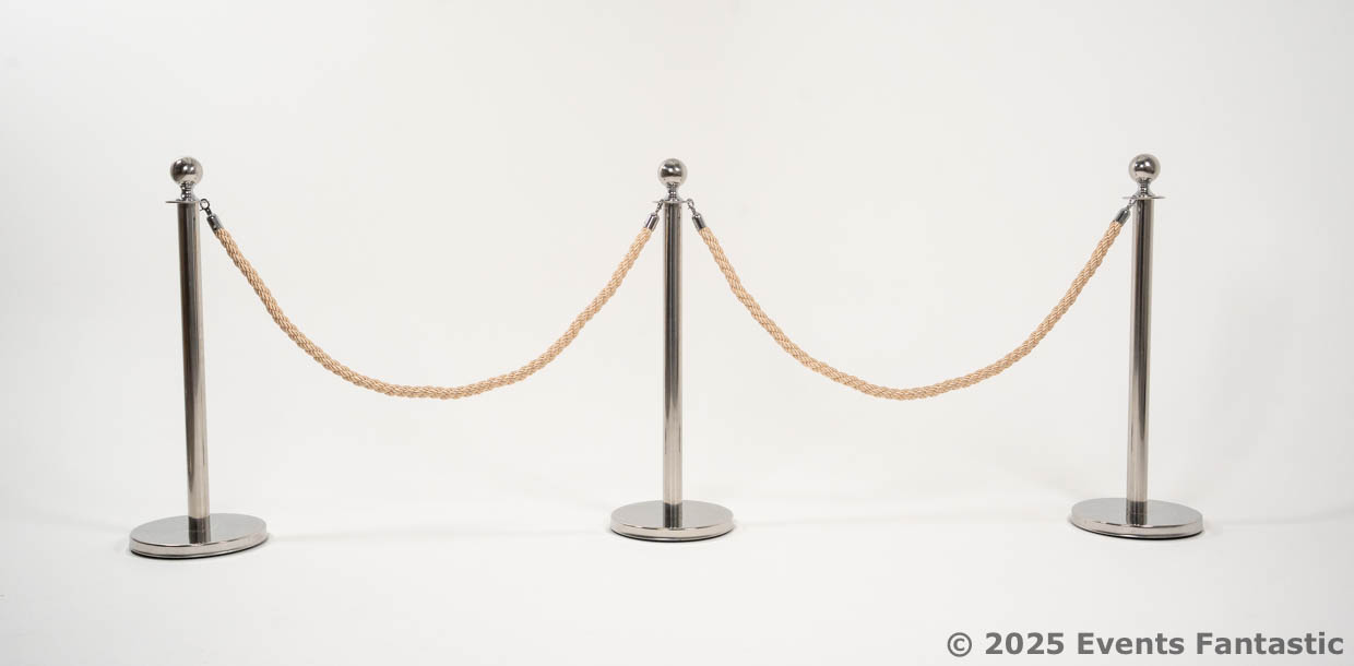 Champagne Rope for Silver Bollards. The luxurious champagne-colored rope paired with sleek silver bollards creates a polished and refined look that’s perfect for any occasion. Whether you’re organizing a glamorous gala, a high-end wedding, or a corporate function, these ropes add a subtle yet undeniable touch of class. The soft hue of champagne seamlessly complements a variety of decor styles, making it an adaptable choice for creating VIP areas or managing queues in style. It’s the little details like these that elevate your event to the next level.