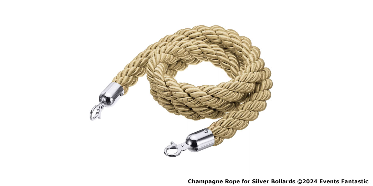 Champagne Rope for Silver Bollards offers a stylish solution for managing crowds with finesse. From registration areas to ticket lines and entrance queues, these ropes guide your guests effortlessly while maintaining the elegance of your event. Perfect for managing high-traffic areas, the champagne rope adds a soft sophistication to your crowd control needs without compromising on practicality. Guests will appreciate the aesthetic touch, and your event will maintain an air of exclusivity and order.