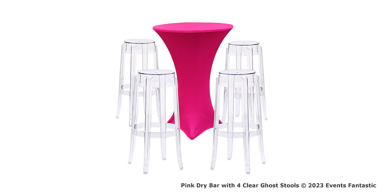Don't compromise on comfort while aiming for style. The Pink Dry Bar with 4 Clear Ghost Package combines ergonomically designed ghost stools with a spacious dry bar for an inviting, luxurious experience. Crafted with high-quality materials, the solid construction and transparent aesthetics of the ghost stools offer sturdy seating without obstructing the view. The dry bar surface is ideal for placing drinks, hors d'oeuvres, or even decorative elements, making it functional and fabulous. Turn your event into an unforgettable experience with the Pink Dry Bar with 4 Clear Ghost Package – a trendsetting decor combo that promises to transform any venue into a lively, glamorous space. Discover the magic of mingling in style and create memories wrapped in elegance and comfort.Answers to your questions